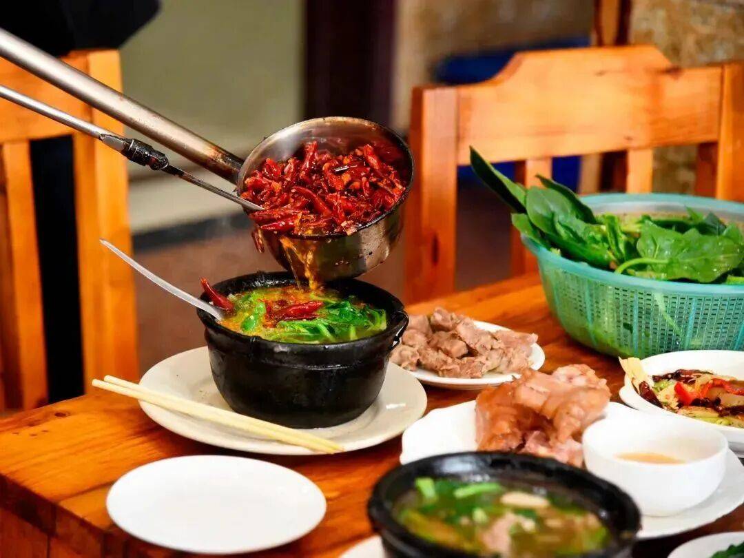 武陟砂锅历史悠久,其特色就是白煮,把肉类食材放入砂锅用微火慢慢煨煮几个小时,汤味浓厚,肉质香烂,可谓原汤原汁。因砂锅不易散热,离火后锅中会继续滚煮,这时,加入嫩绿的小青菜和刚炸好的鲜红辣椒油,色彩艳丽,香气扑鼻,可谓不可不尝的美味佳肴。