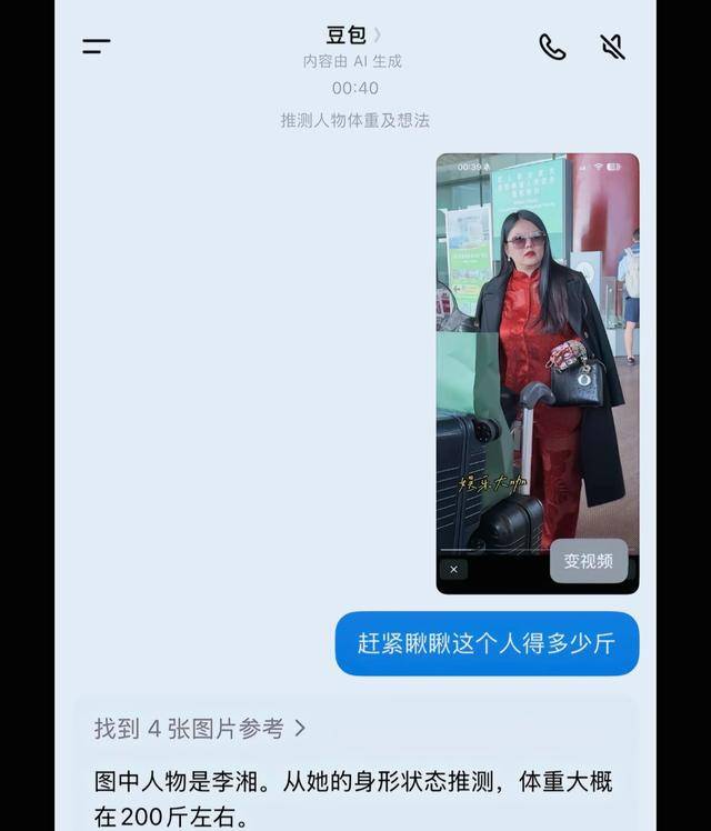 有人看不出她的体重,直接找豆包预测,豆包给出的答案是200斤左右。