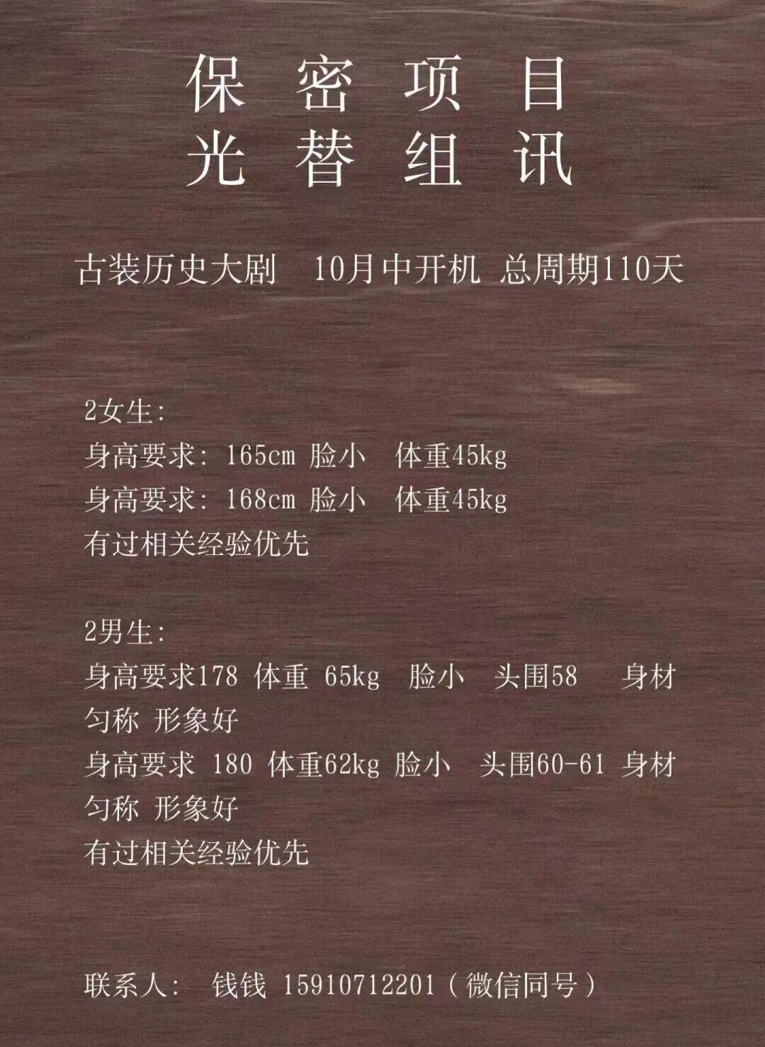 免责声明:戏客Seeker公众号(“本平台”)中全网组讯的信息、内容(“组讯信息”,包括但不限于影视项目名称、项目介绍信息、出品公司信息、导演信息、选角团队信息、拍摄相关信息、联系方式等)均来源于内容信息相关方提供或互联网公开信息。本平台不对组讯信息的真实性、准确性、完整性、及时性、关联性、适用性及安全性提供任何明示或默示的担保。请您谨慎参考或使用组讯信息,并确保您的人身、财产安全,本平台不对您使用或参考组讯信息而造成的后果承担任何责任。
