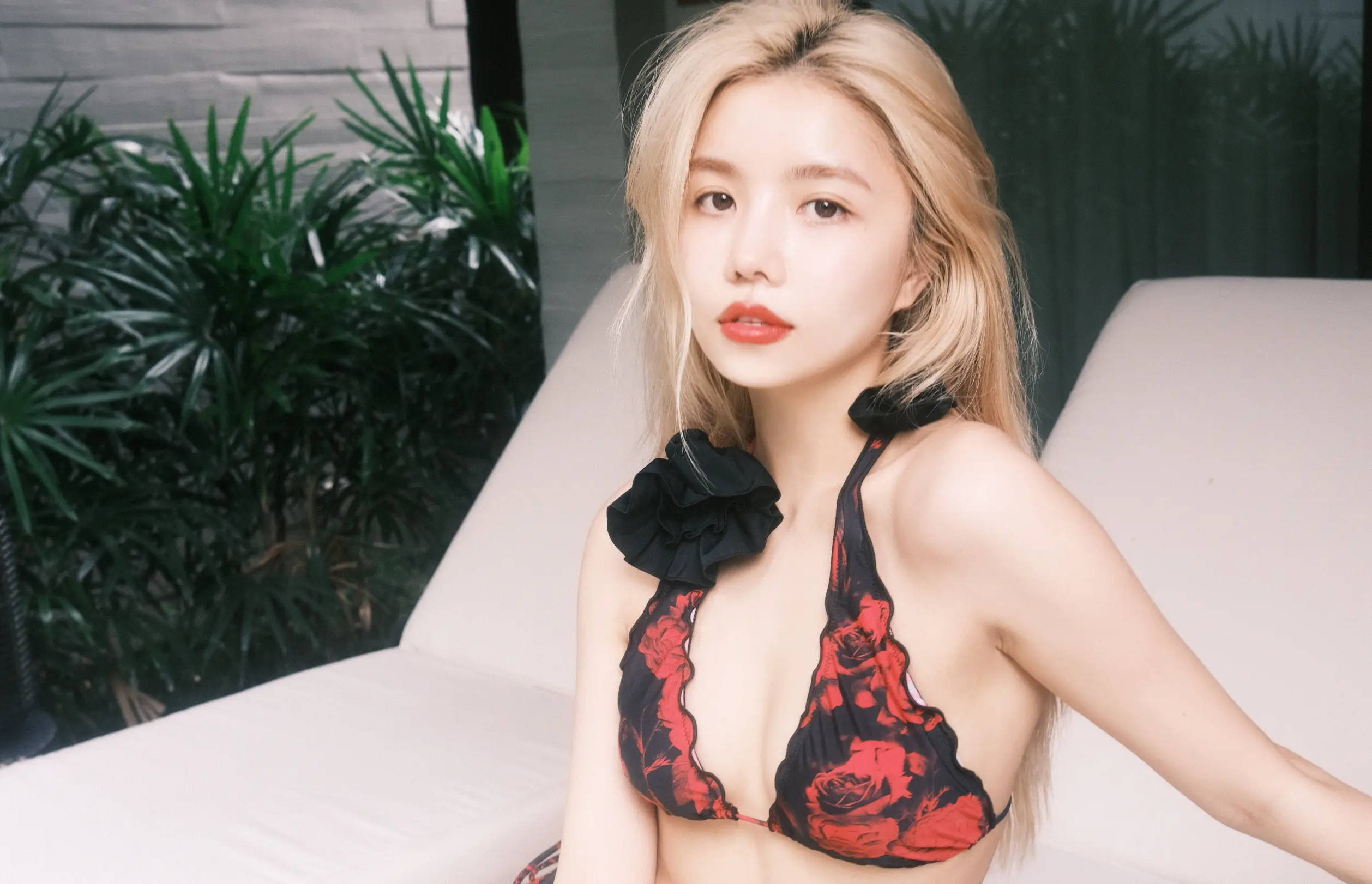 搜狐娱乐讯 7月29日,安崎晒出一组泳装写真。她身着红黑印花比基尼,性感妖艳,一头金发辣妹感拉满。