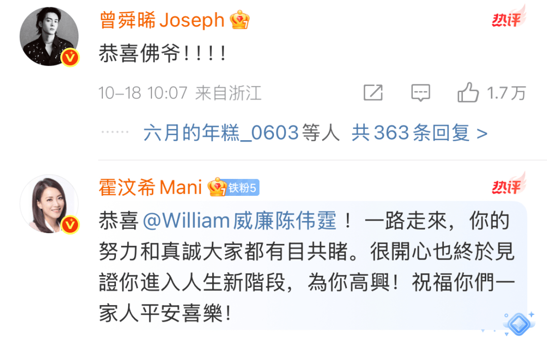 在评论区,演员曾舜晞和经纪人霍汶希也送上了祝福。