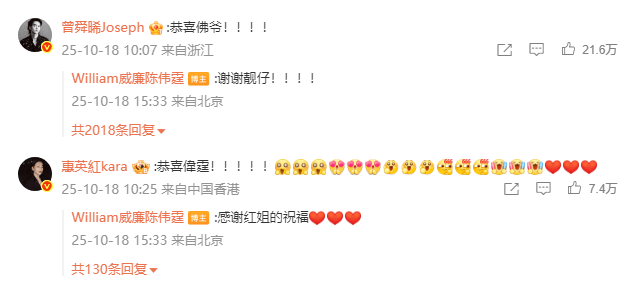 曾舜晞、惠英红、谭耀文、陈瑶、杨迪、南派三叔、霍汶希、林峯、黄雅莉、刘雅瑟、刘雨昕等人纷纷现身恭喜陈伟霆当爸。