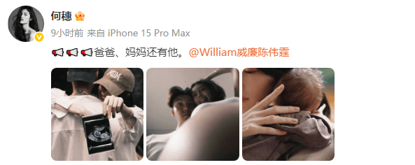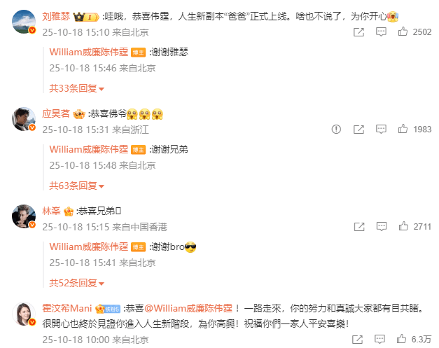 2025年10月18日:陈伟霆何穗晒照官宣得子。
