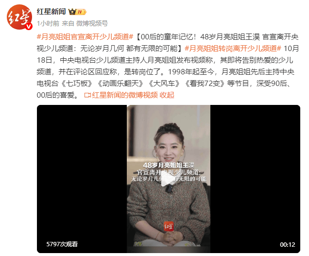 10月18日,中央电视台少儿频道主持人月亮姐姐发布视频称,其即将告别热爱的少儿频道,并在评论区回应称,是转岗位了。
