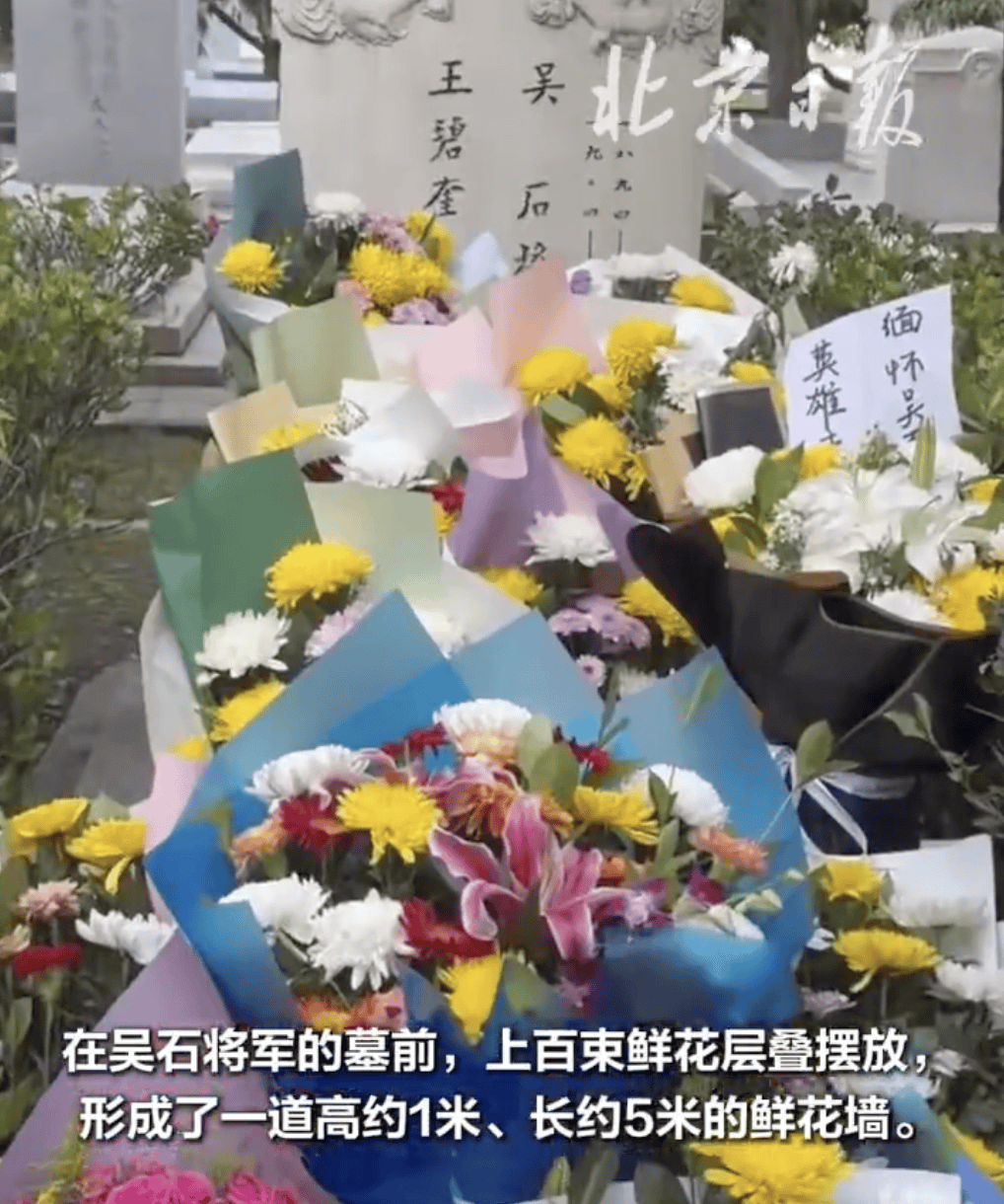 在吴石将军的墓前,上百束鲜花层叠摆放,形成了一道高约1米、长约5米的鲜花墙。不少鲜花上还留有“缅怀吴石 英雄永存”的寄语。来到墓前的市民,会在墓碑前肃立,静静地阅读碑文,三鞠躬后献上花束。有些市民不能亲自前来,委托外卖骑手将鲜花送到墓前。