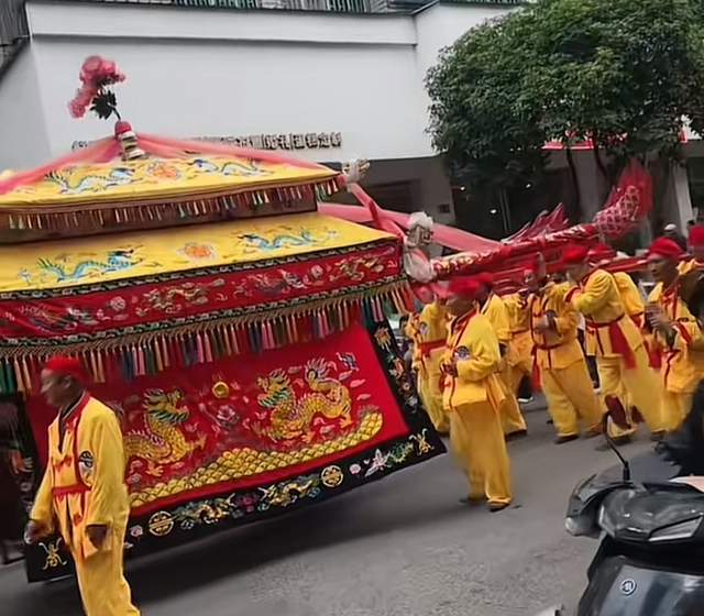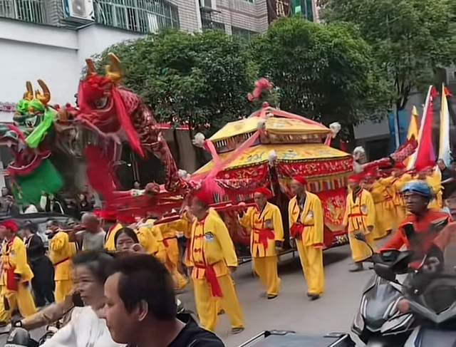 整个送葬队伍长达百余米,中间则是一尊看起来类似轿子的物体,头部则是两条龙,下方则站满了人,尾部也有同样数量的“轿夫”,不过中间的并不是坐轿子的人,而是棺材,这一形式流行于山西等地,不过也是身份的“象征”。