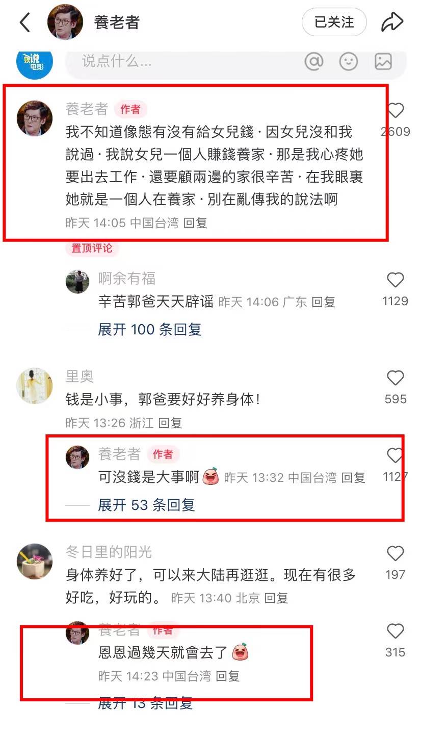 网友安慰郭爸爸钱是小事,要好好养身体,但郭爸爸回复表示可没钱是大事啊。还透露过几天要来内地,估计郭碧婷在内地也有工作,所以会带爸爸来看看,当然也有可能是和婆婆们见面,他们想孙子孙女了吧?