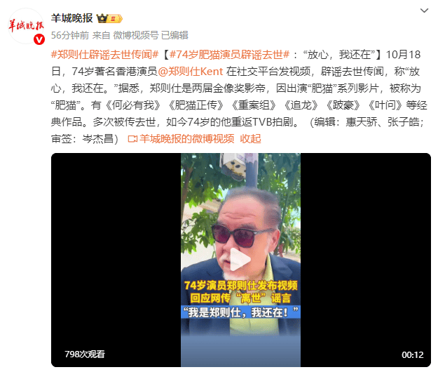 10月18日,74岁著名香港演员郑则仕在社交平台发视频,辟谣去世传闻,称“放心,我还在”。