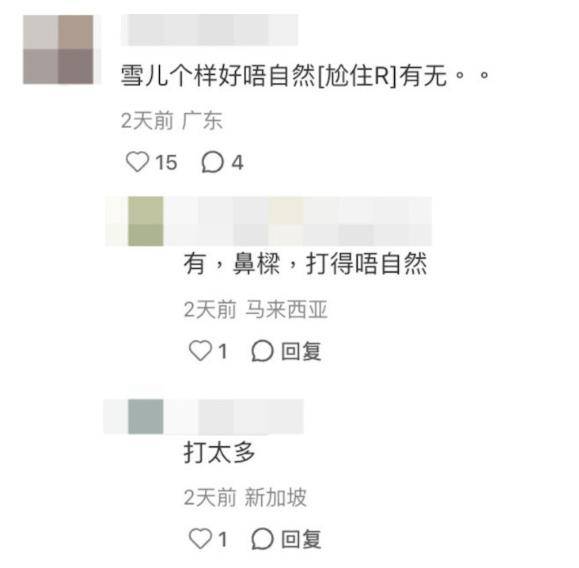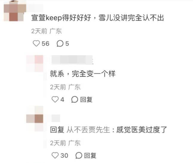 不过,也有网友关注到雪儿的样貌,称她以往的大眼睛如今似乎难以睁开,面部轮廓也十分不自然,留言称:“雪儿的样子好不自然、雪儿侧面还能认出来,正面完全没认出来、雪儿简直认不出了”。