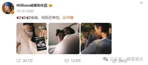 上周六,陈伟霆、何穗共同在微博宣布已经升级为爸爸、妈妈。