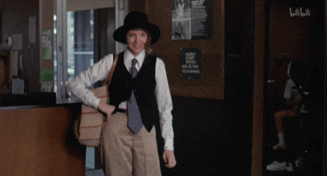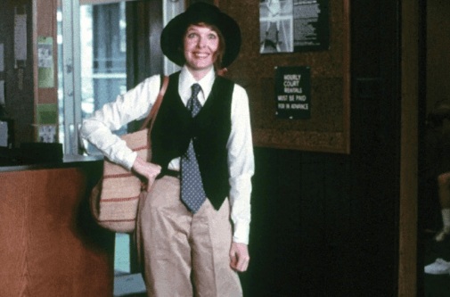《安妮·霍尔》里,白色衬衫、宽领带、羊毛马甲、卡其色阔腿裤的造型,被电影的服装设计师抱怨「太像男人」。
