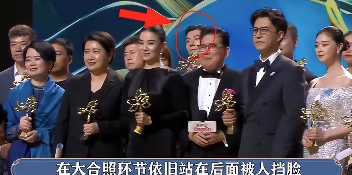 一旁还有个拿到最佳男配角的蒋奇明,本来位置还挺前的,结果一下子被挤到了后排,只能踮着脚,举着奖杯,拼命想让镜头里看到他的脸。