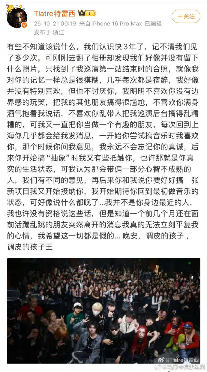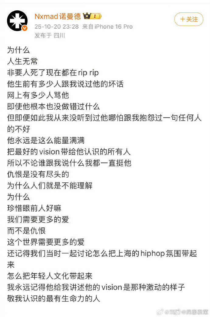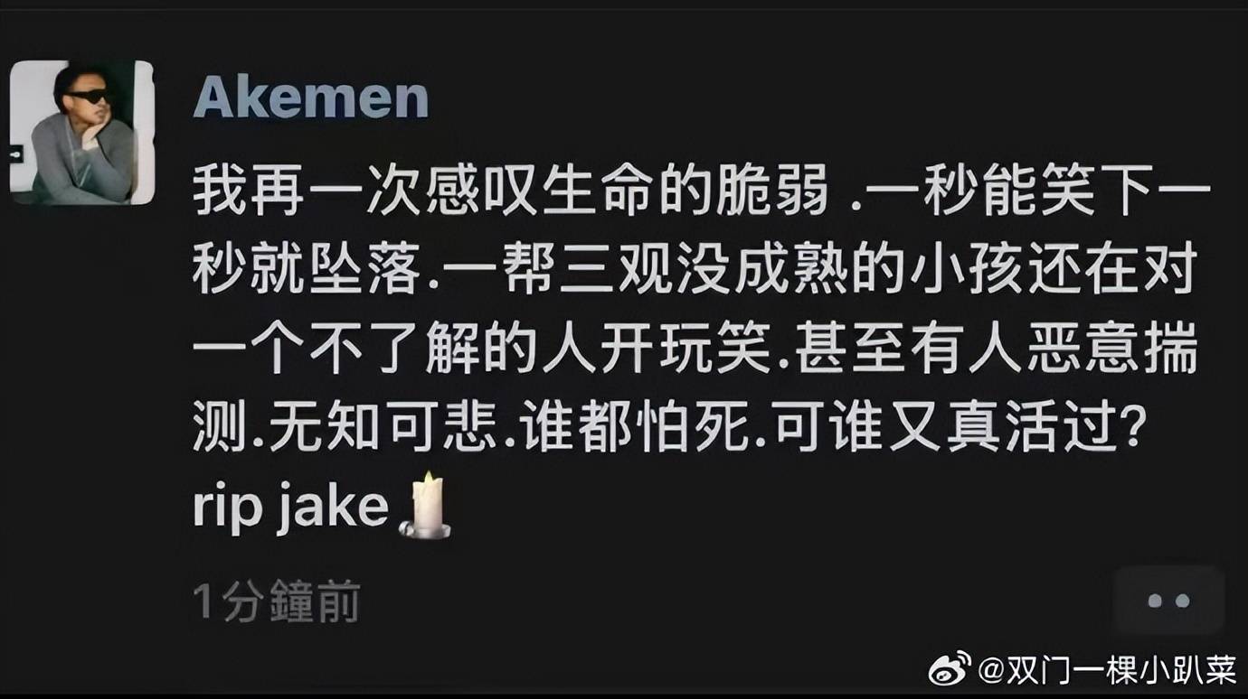 噩耗传来,圈内好友纷纷悼念。说唱歌手诺曼德在追忆中透露,Jake生前长期遭受网络暴力,却始终“能量满满”,更致力推动上海嘻哈文化发展,从未因外界争议抱怨他人。另一好友特雷西则感慨,Jake近年从音乐初心转向抽象风格,近期正试图回归创作本质,不料意外骤至。