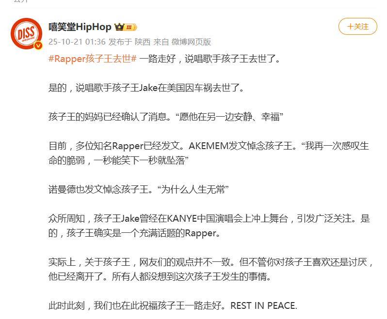 “孩子王Jake”生前从不缺少话题。2024年,他因冲上Kanye海口演唱会舞台被拘一事引爆舆论,其独特的“抽象风格”让公众评价两极分化。有人视他为“哗众取宠”,也有人赞他“打破常规”。但不可否认,这位湖南籍rapper凭借单曲《okok》一度风靡潮流圈,2023年推出首张专辑《Drak Vs Sun》,2025年9月底还刚发布新作,音乐生涯正处上升期。
