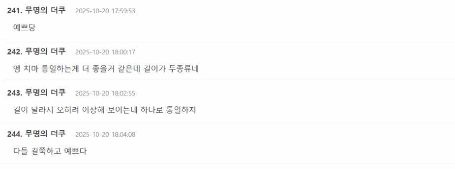 但更多的争议声则指向了服装本身的设计或造型师的失误。有网友一针见血地指出:“呃,如果裙子统一长度应该会更好看吧”,直接点出问题的核心。这条评论迅速获得了大量附议,不少人跟进吐槽:“参差不齐的裙长反而显得怪异,本该统一款式的”。更有毒舌的网友发挥联想,直言不讳地评价:“长裙看起来像惩戒服ㅠ”,将时尚造型与某种压抑感的制服联系了起来。