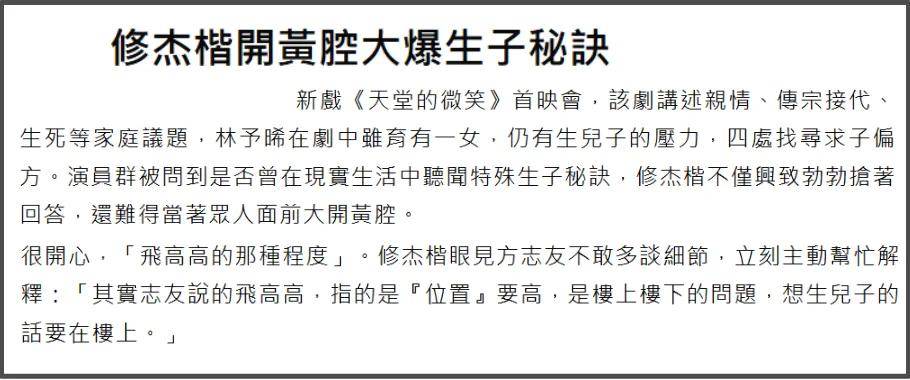 修杰楷还有一个行为非常微妙,他和女演员一起接受采访,聊到所谓生子秘诀,修杰楷瞬间来劲了,大开黄腔兴奋谈起要用什么姿势才能生儿子,俨然一副研究过的模样。