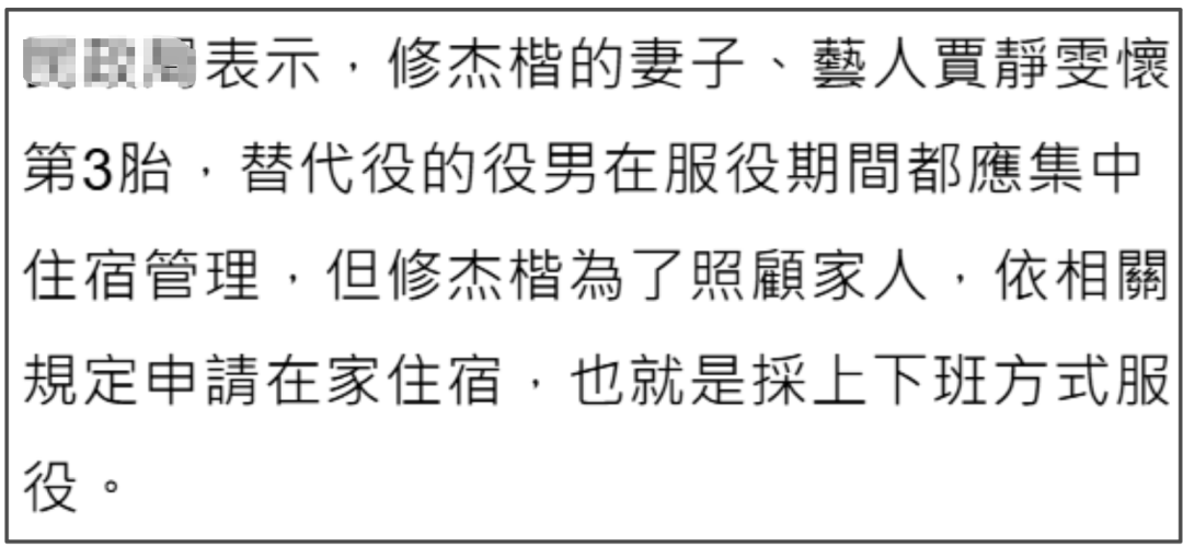 ——原来修杰楷当年没能用上伪造材料,他的老婆贾静雯怀上了三胎,修杰楷就服了替代役,只需要到相关部门上下班五个月就可以了,对比正式服役更轻松,还可以每天回家。
