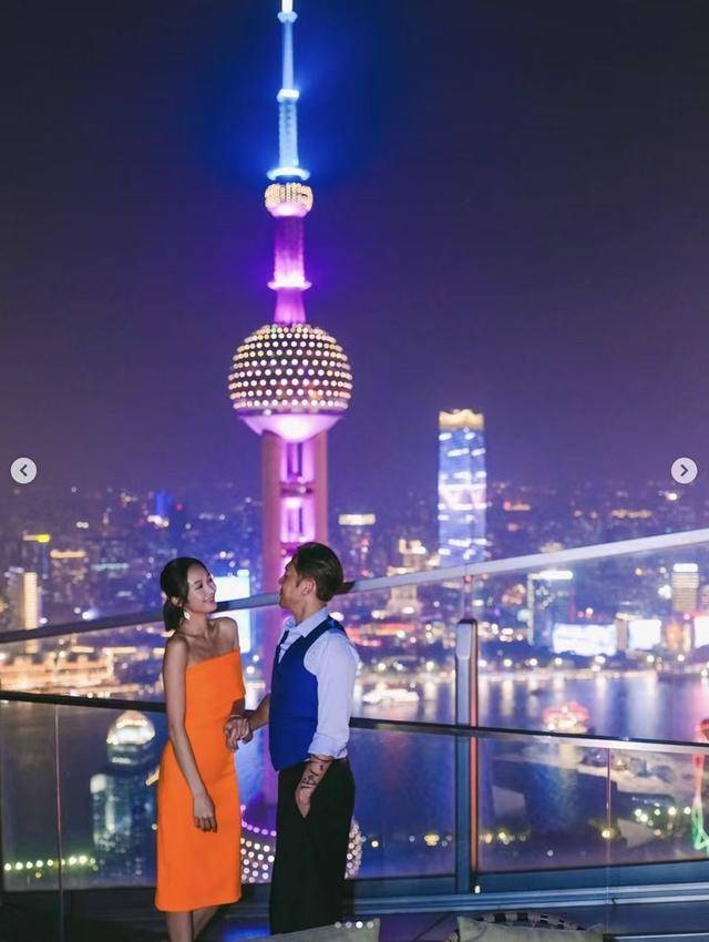 可以看到当天的汤怡身穿着一条橙色的贴身连衣裙,二人在上海外滩拍照留念,画面可以说是非常温馨浪漫。