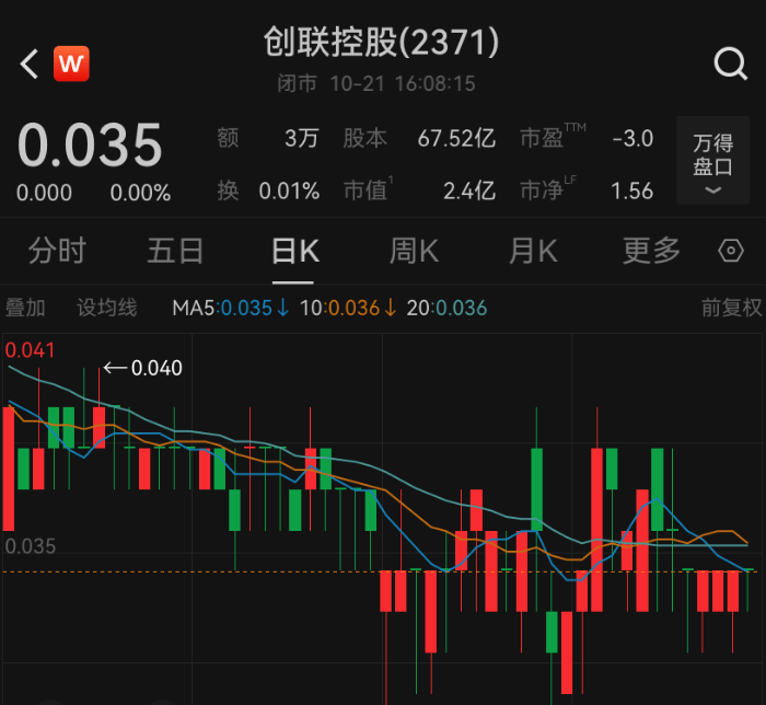 截至10月17日收盘,创联控股股价仅0.035港元,总市值缩水至2.36亿港元。