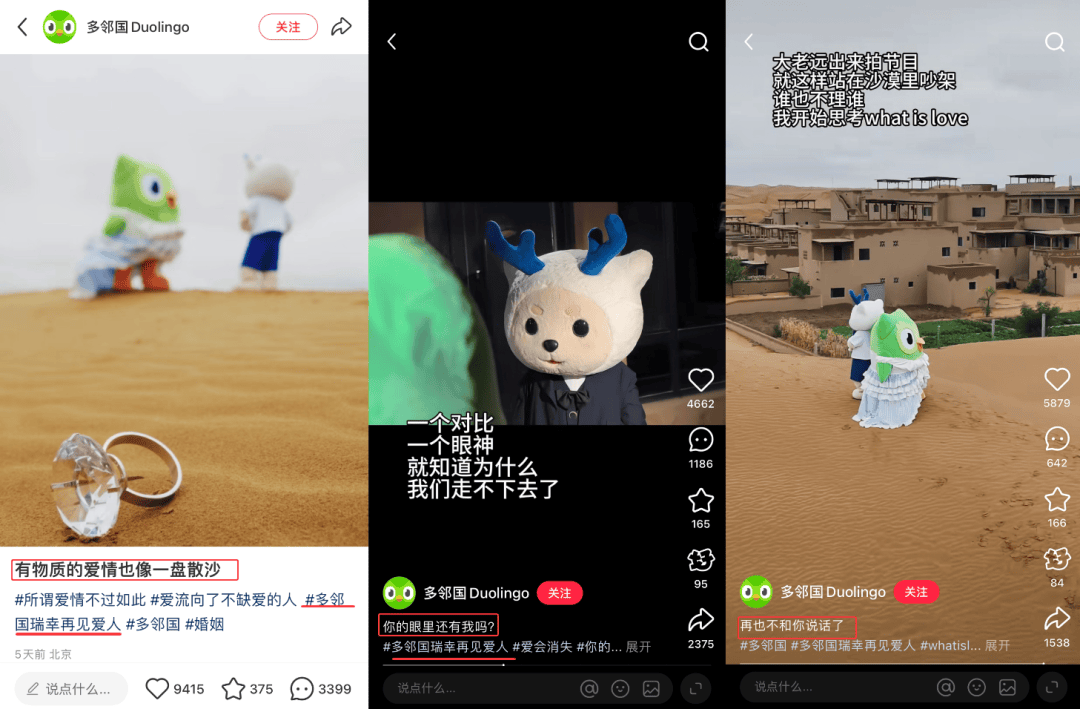 当社交媒体上传出瑞幸与多邻国婚变消息的时候,兵法先生赶紧去围观了一下,发现在《再见爱人 5》播出的前夕,多邻国发了一张带有「再见,爱人」文案的海报,同时在自己的“日常更新”中带上了话题#多邻国瑞幸再见爱人 #爱会消失 #你的眼神出卖了你 ,不爱了的韵味明显。