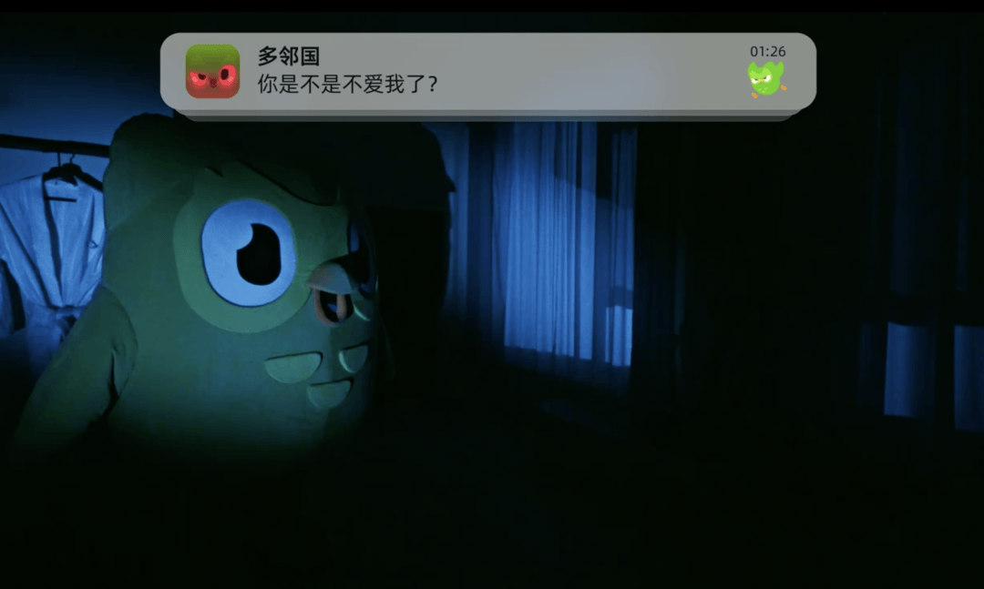 同时,多邻国还模仿《再见爱人》风格,推出了一支《爱是我们学不会的语言》的短片,将他们之间的问题一一展现,甚至发出了灵魂拷问「鸟鹿CP只是童话吗」「当热度褪去,爱的本质是什么」……