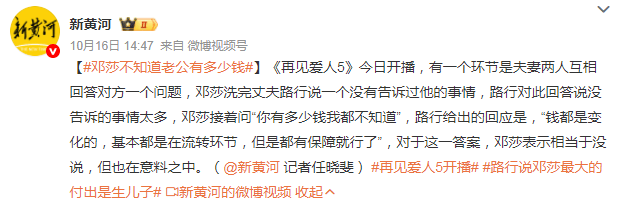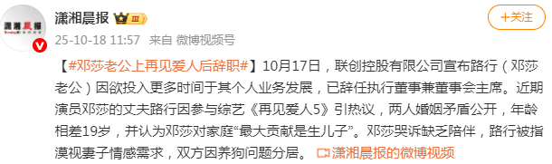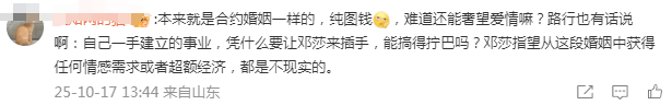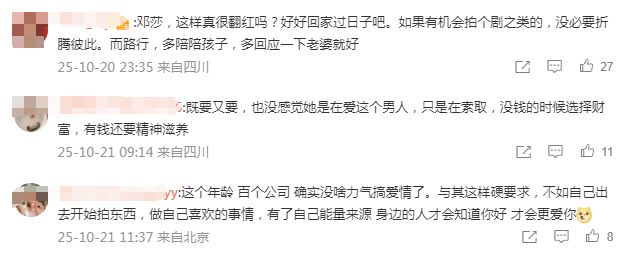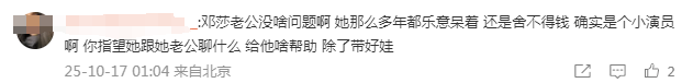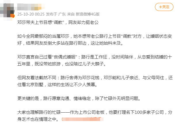 意思就是说,路行是邓莎当年自己选择的人,奉子成婚、放弃事业、回归家庭也同样都是她自己的选择,咱不能享受完了富豪生活又怪老公情感缺失,甚至还试图借助网友、舆论来调教老公吧?