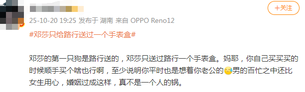这表盒疑似还是邓莎逛街的时候顺手买的……不少网友锐评,即便双方经济实力存在差距,那也不至于结婚十来年,就送过这么一次礼物吧?就这还吐槽男方冷漠回避呢,她自己也没上心到哪去啊。
