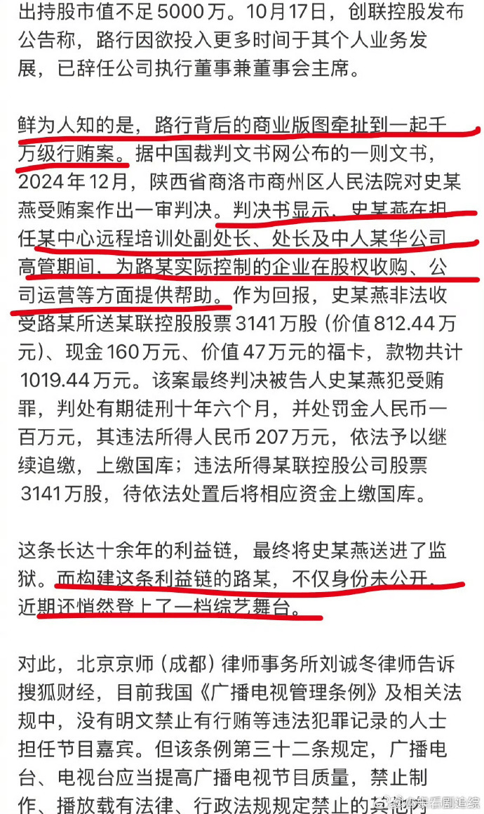 “而构建这条利益链的路某,不仅身份未公开,近期还悄然登上了一档综艺舞台”,虽然咱目前确实没有明文规定,有行贿等违法犯罪记录的人能不能上节目当嘉宾,但这事儿要是真的……