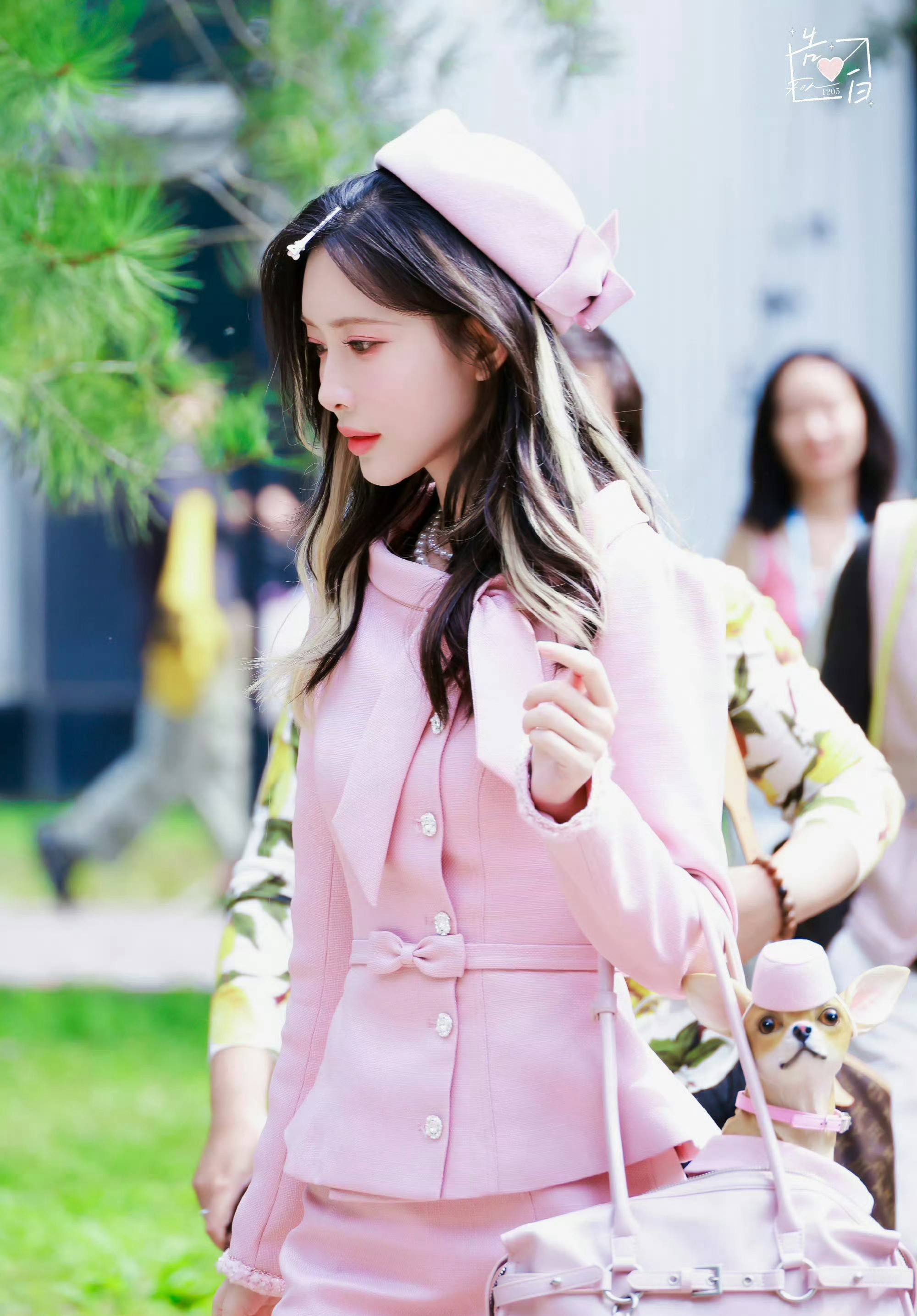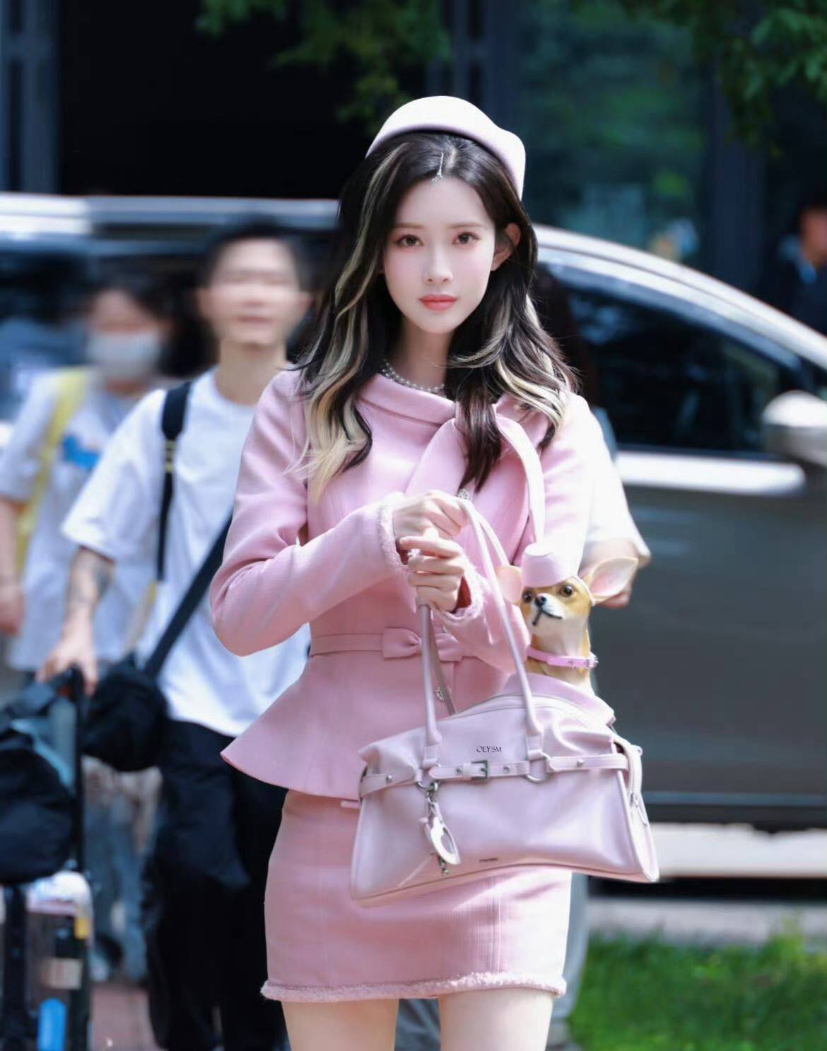 孟子义包里放着小狗,可爱俏皮。