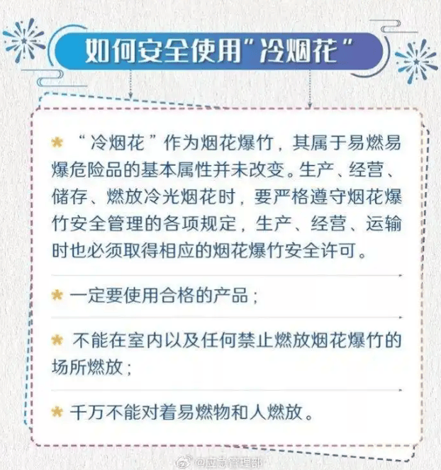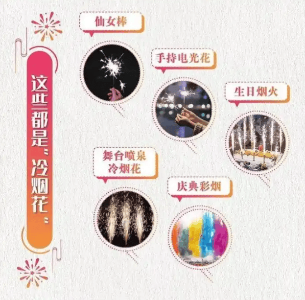 冷光烟花俗称“冷烟花”属于烟花爆竹产品。由于燃放时,火焰(火花)喷出后,温度迅速降低,距喷射口20厘米处,温度降至约80℃,距喷射口50厘米处,温度降至约40℃,被大家称为“冷烟花”。