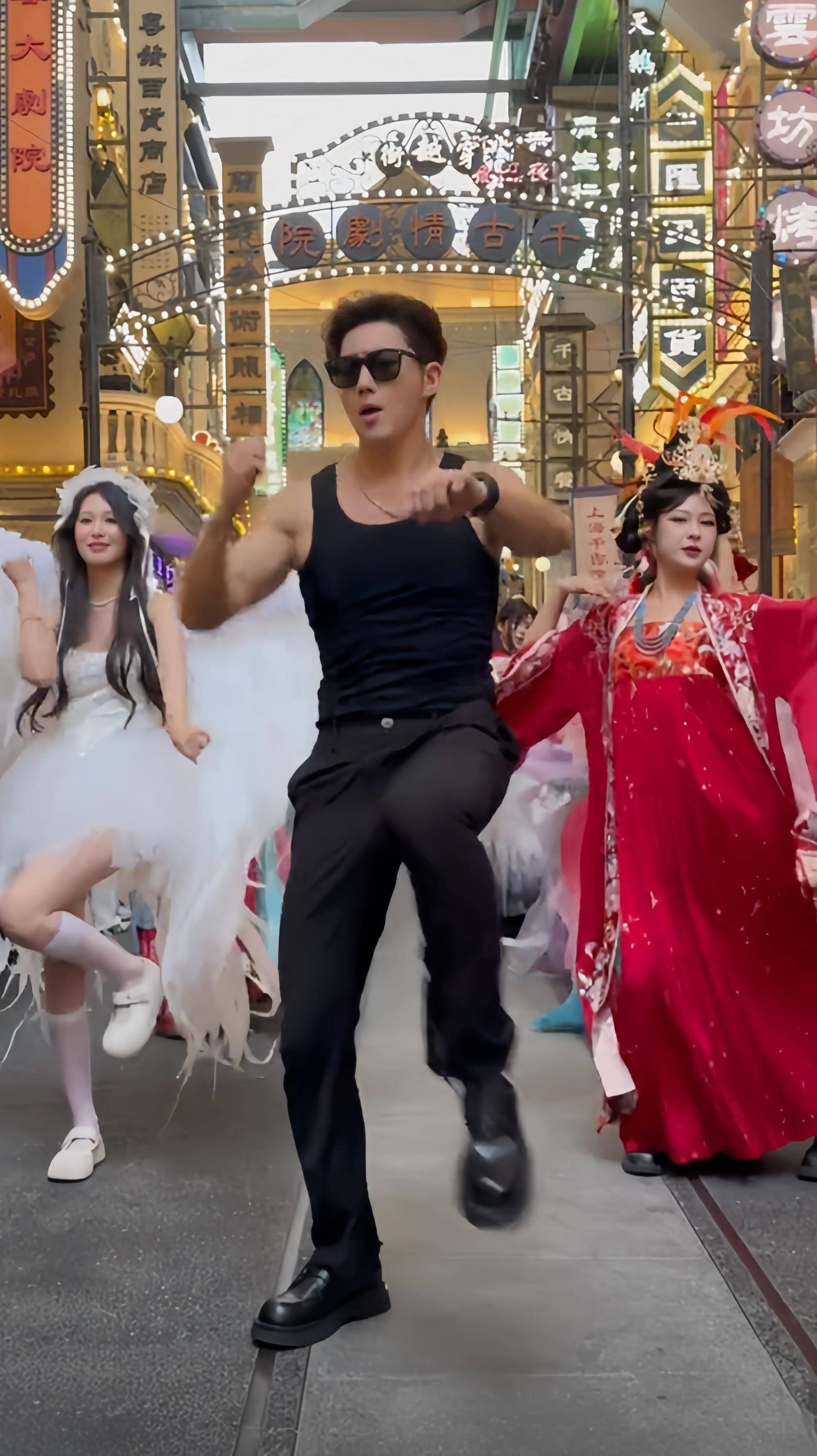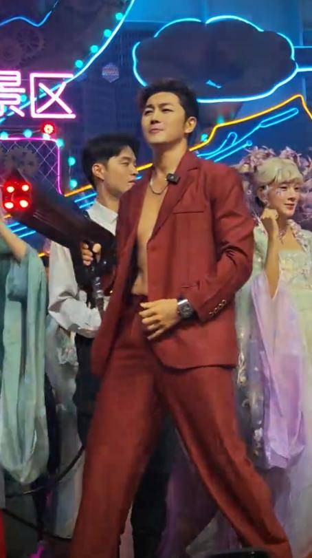 第二天他又跑到杭州宋城,换上黑色侠客服,大秀肌肉线条,和林教头一起热舞,看着比演电视剧还卖力。