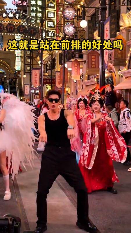 有游客拍视频说,他跟人互动特别自然,一会儿给观众跳舞,一会儿帮人拍照,还会说冷笑话活跃气氛。