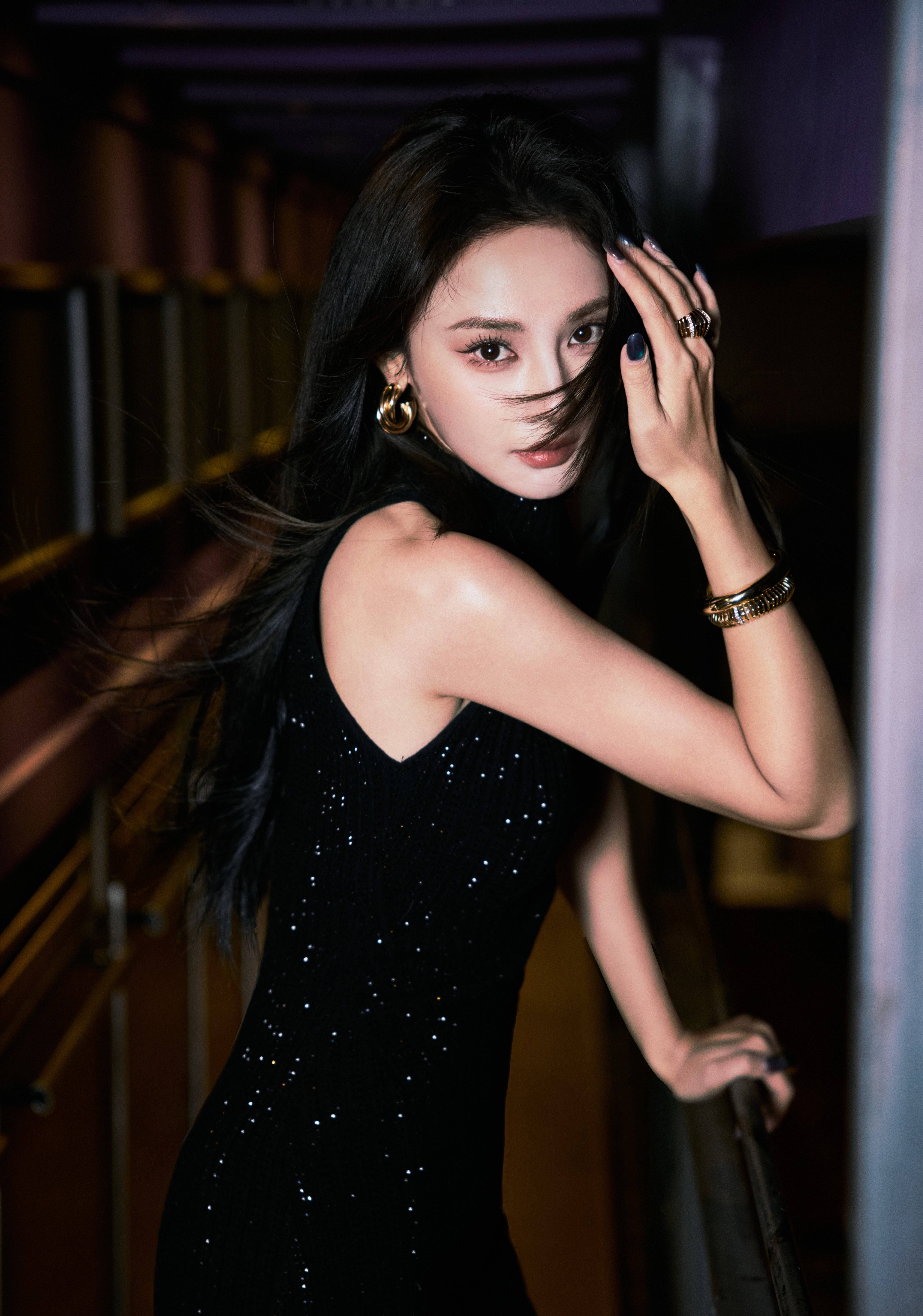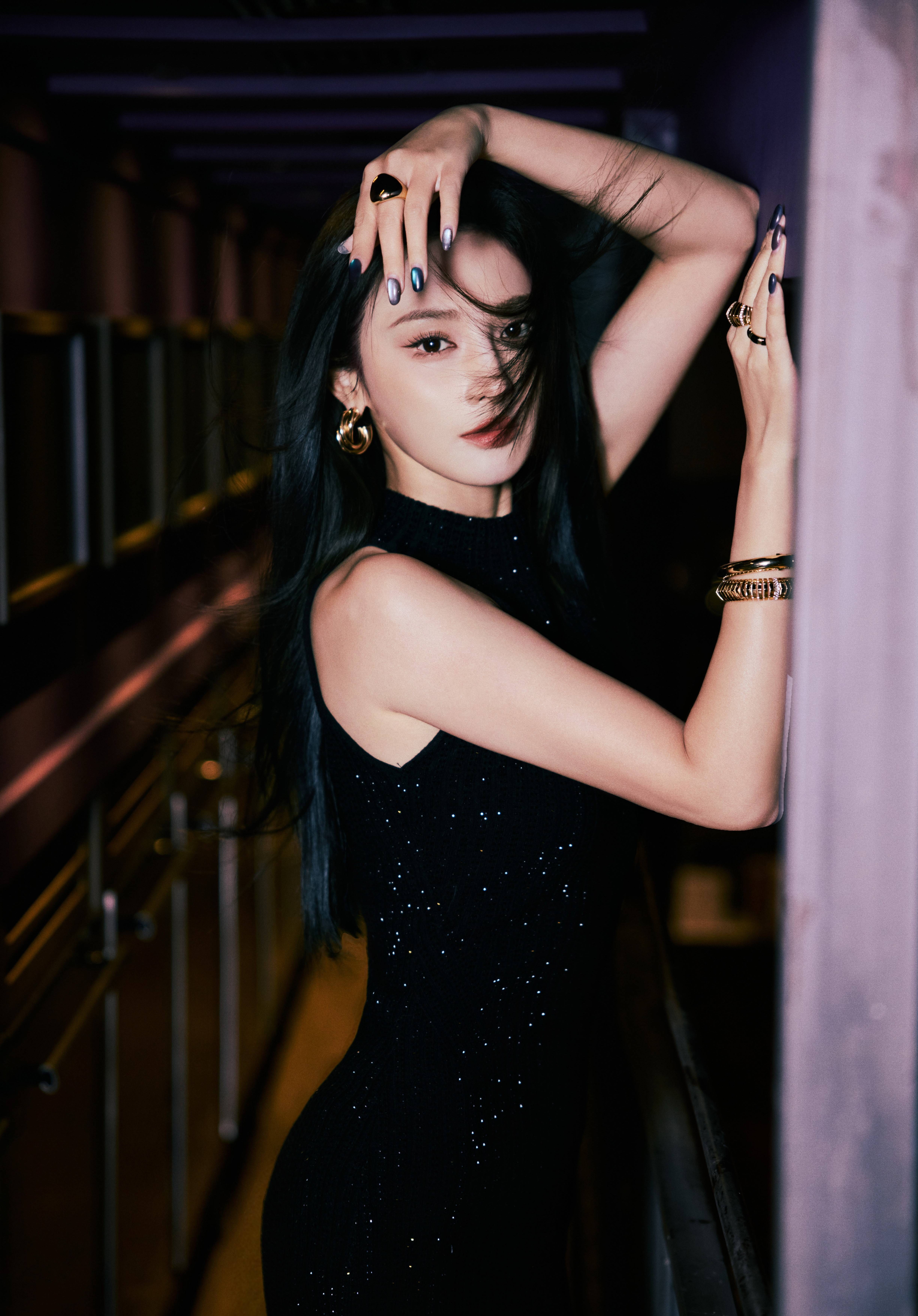 彭小苒戴金色手环,女人味儿十足。