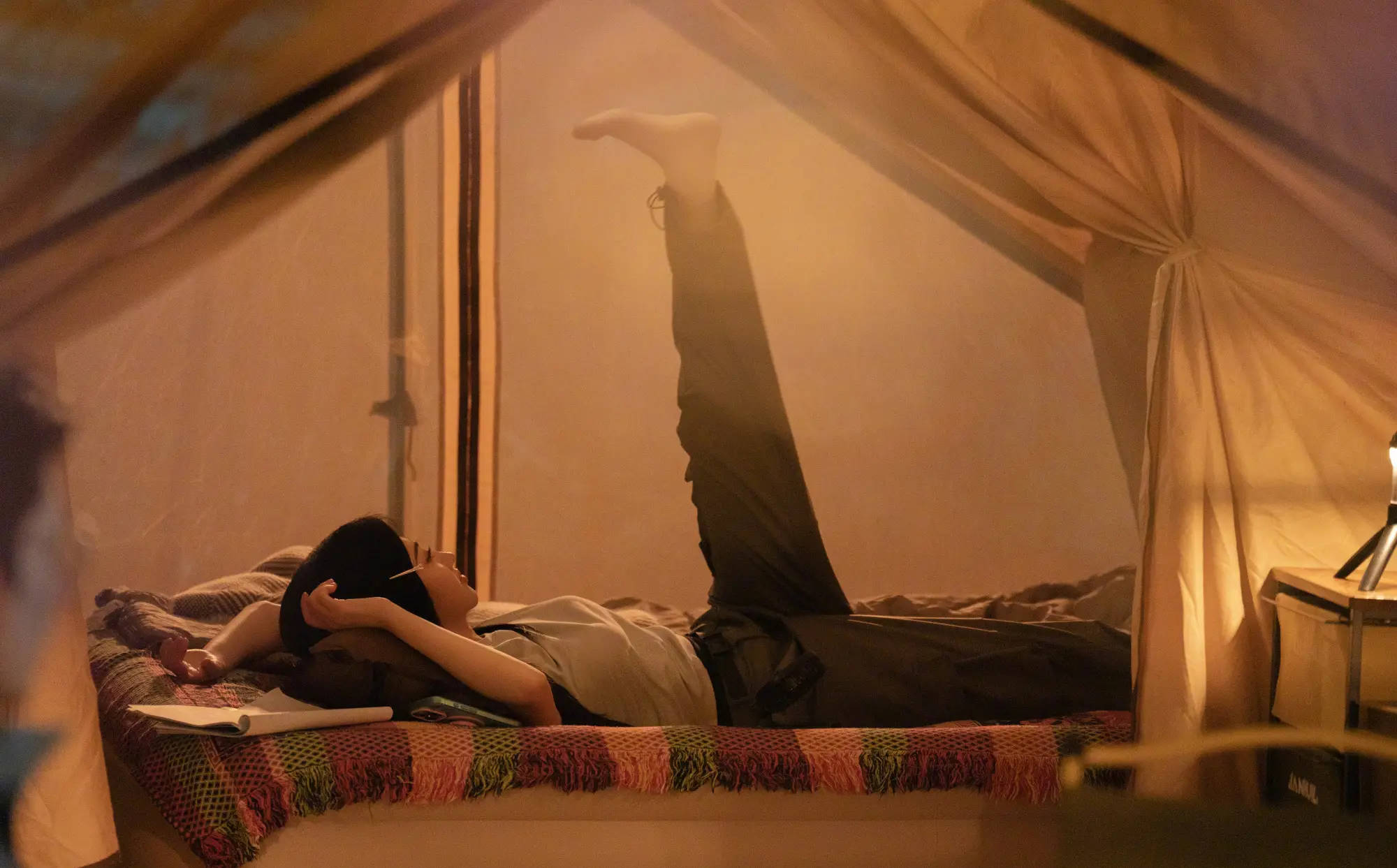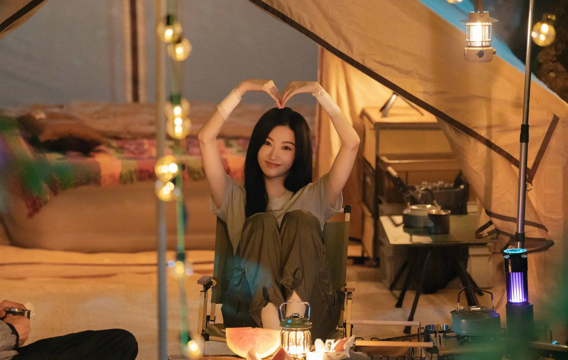 景甜坐在帐篷旁对着镜头比心,十分甜美迷人。