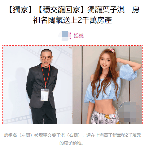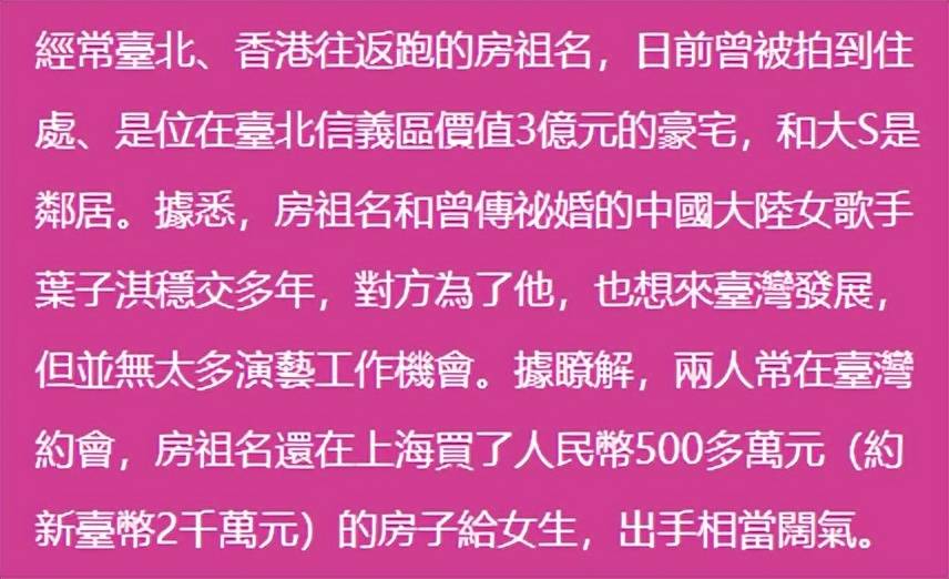 报道称,房祖名已经将叶子淇“私有化”,还在上海买了500万的房子送给她,女方也曾受访表示房祖名个性很好,体贴孝顺,很多女孩都会喜欢。