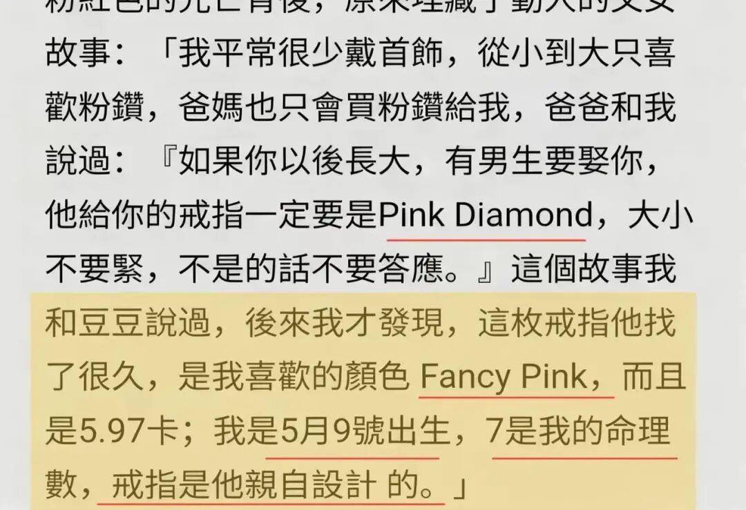 何超莲分享的求婚细节里讲到,窦骁亲自设计粉色钻戒向她求婚,重量是她生日数字——“5.9”。