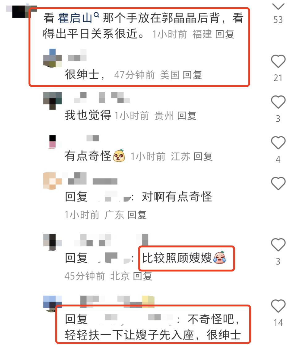 在入座时,有网友认出了这一家人,霍启山站在霍启刚和郭晶晶的中间,看到哥哥霍启刚先入座后,霍启山转身扶着郭晶晶的背,轻推嫂子先进去,让她可以坐在霍启刚的旁边。