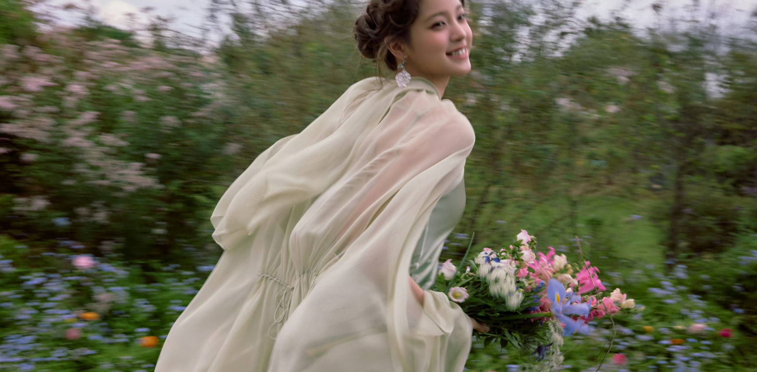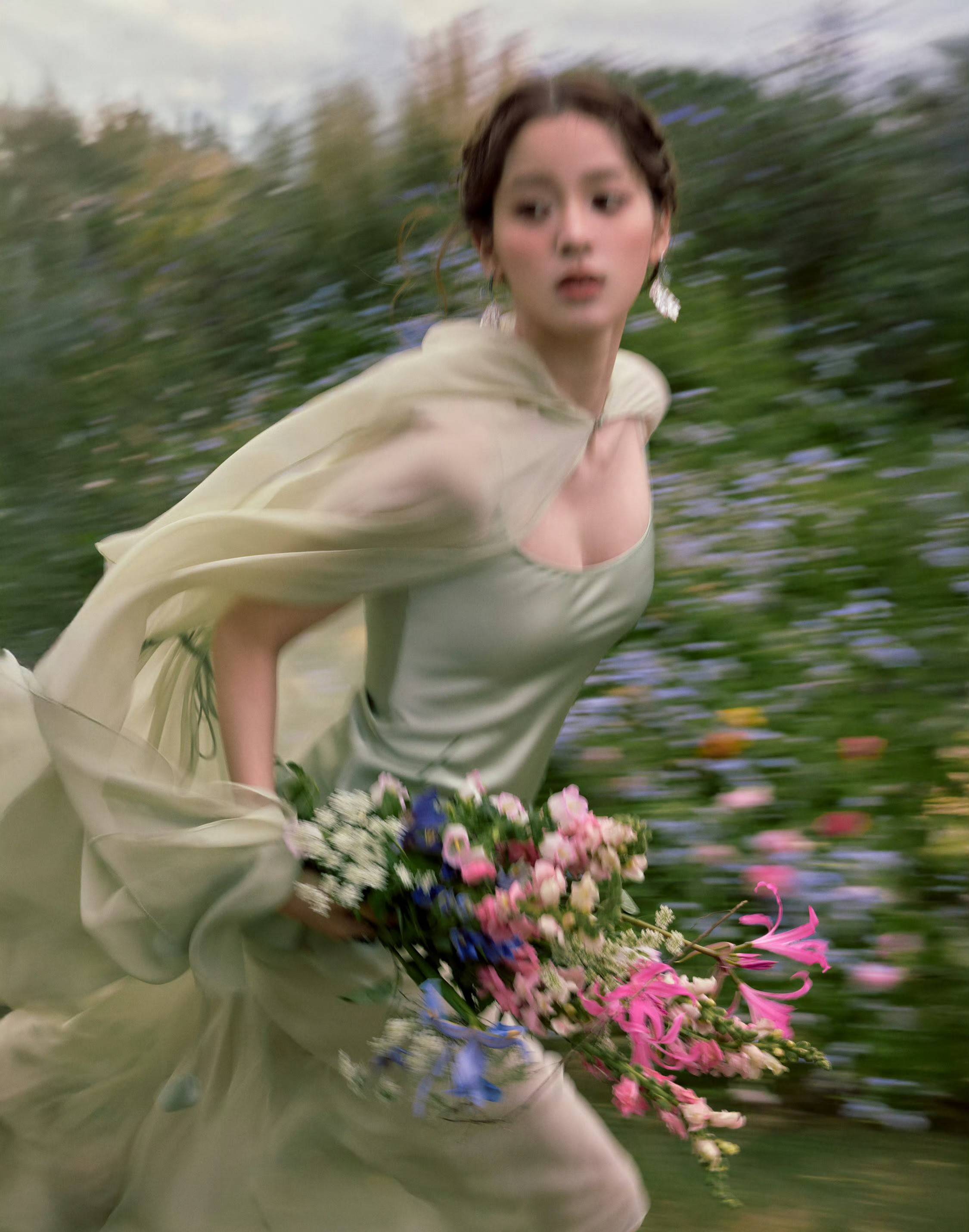 欧阳娜娜手持花束在花海中奔跑,灵气十足。