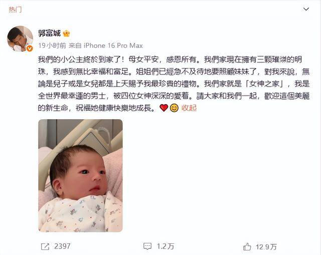 天王郭富城欣喜宣布三胎女儿顺利出生,配文充满幸福: