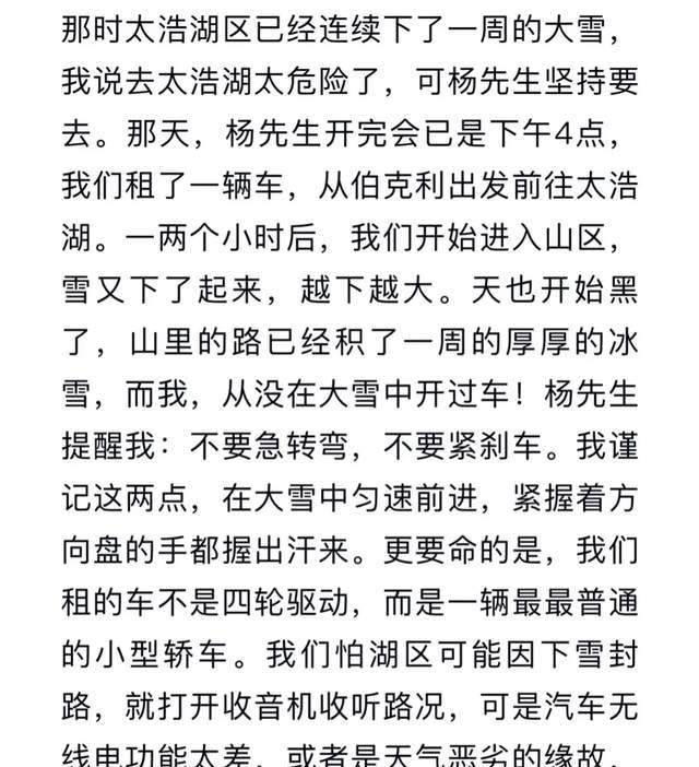 最有趣的一回是从伯克利驾车前往太浩湖区,白天时杨老还在参加会议,持续开到下午4点,工作结束之后,他携妻子翁帆前往已下了一星期雪的太浩湖区。