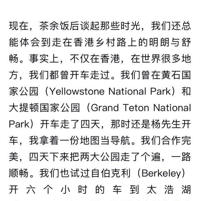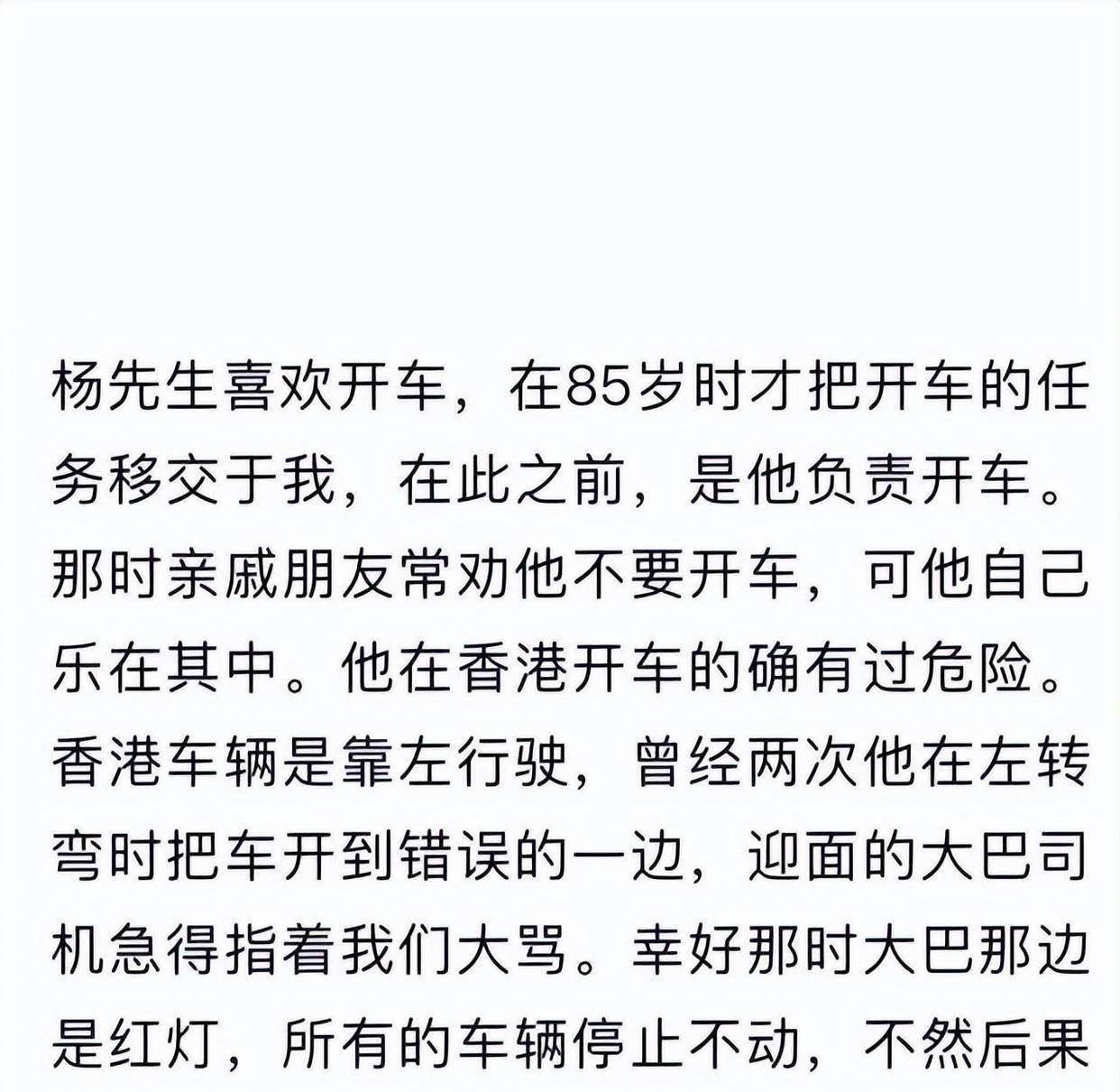 在长文首段,她这样写道:直到85岁,杨先生才将开车之事交由我负责,此前他一直热衷于驾车。