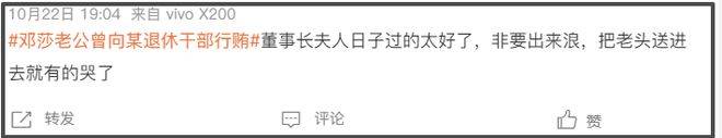 据透露,路行曾向一名退休官员行贿千万,该官员因而被判刑10年6个月。尽管路行并未因此遭到追责,但随着他参与综艺节目,过往的丑闻被重新挖掘出来。此事曝光后,网络上的讨论逐渐升温。很多网友指责邓莎,认为她生活得如此幸福,偏偏要拉着丈夫一起上节目,若是路行因此被牵连,邓莎恐怕会陷入困境。