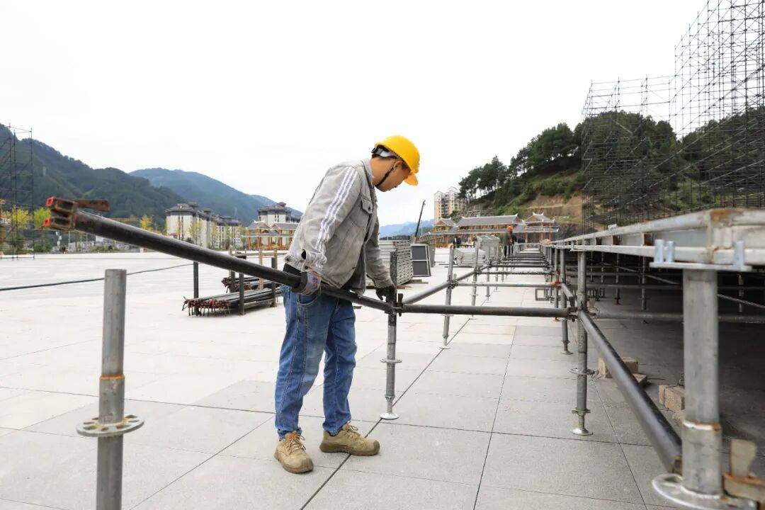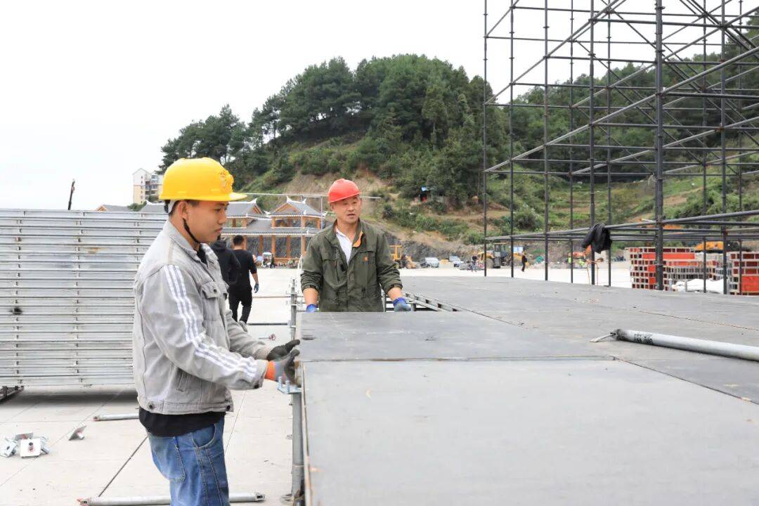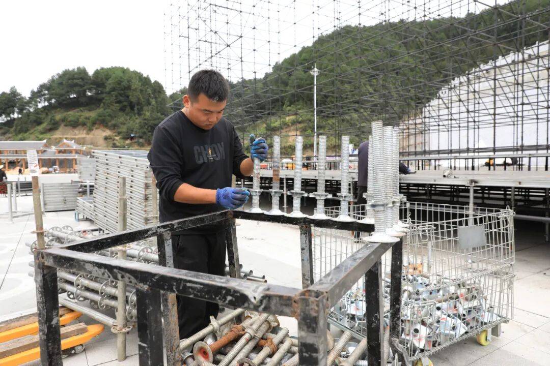 演员们加紧排练的同时,全国村歌大赛总决赛的活动现场也忙碌着。工人们抢抓时间,搭建舞台、安装更衣室、接通电源、查验控制室等各项工作都在有条不紊地推进。每一个环节都精益求精,确保舞台声光电效果完美呈现,为观众带来一场震撼的视听盛宴。