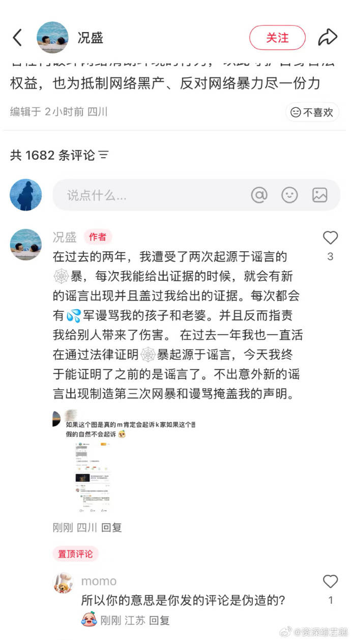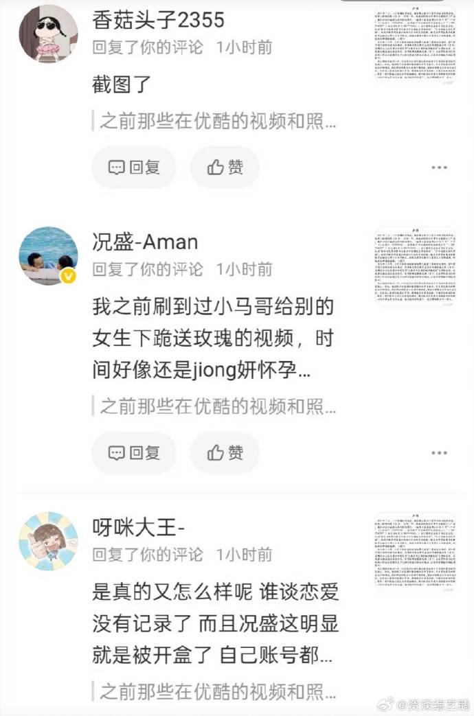 在声明发布后,况盛使用认证账号在评论区留言称:“我之前刷到过小马哥(马杨)给别的女生下跪送玫瑰的视频,时间好像是君妍怀孕那会。”此言论迅速被网友截图传播,尽管他随后秒删并置顶声明自称“被网暴”,却始终未直接否认自己爆料的内容。