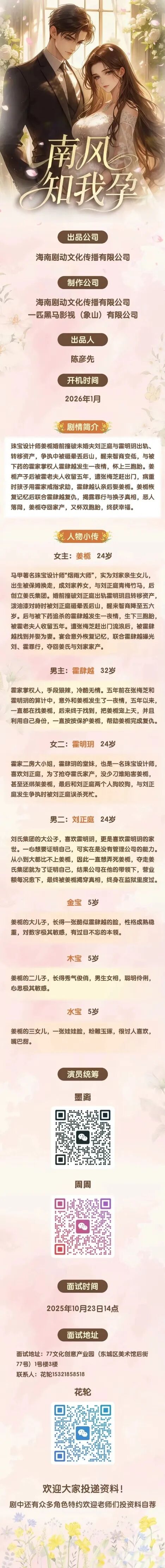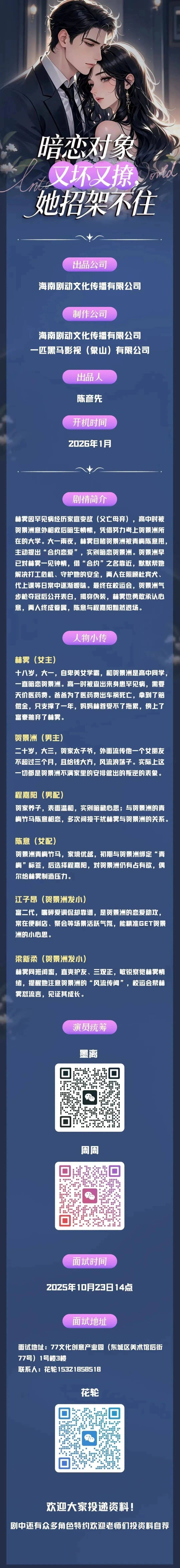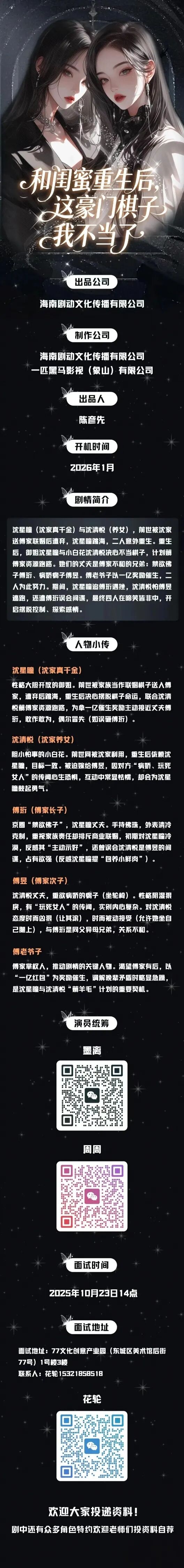免责声明:戏客Seeker公众号(“本平台”)中全网组讯的信息、内容(“组讯信息”,包括但不限于影视项目名称、项目介绍信息、出品公司信息、导演信息、选角团队信息、拍摄相关信息、联系方式等)均来源于内容信息相关方提供或互联网公开信息。本平台不对组讯信息的真实性、准确性、完整性、及时性、关联性、适用性及安全性提供任何明示或默示的担保。请您谨慎参考或使用组讯信息,并确保您的人身、财产安全,本平台不对您使用或参考组讯信息而造成的后果承担任何责任。