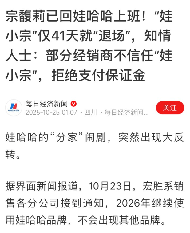 而宗馥莉回来上班的理由,主要的原因,很可能就是因为部分经销商并不信任宗馥莉的“娃小宗”。