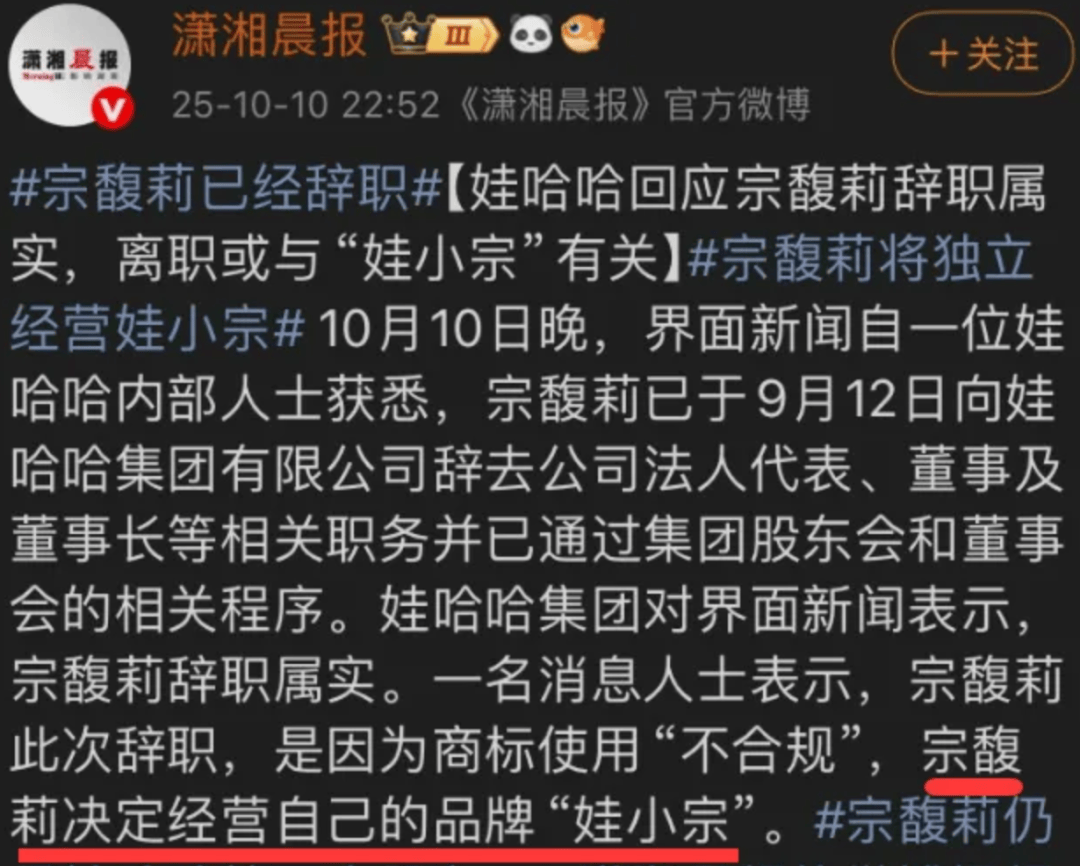 因为早在前两周,媒体还在报道,宗馥莉已经在娃哈哈辞职,选择另立门户: