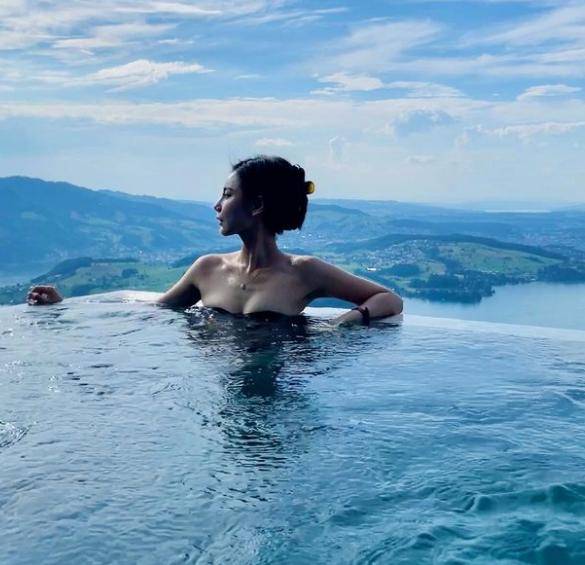 21日,小梅晒出在海景豪宅套房之中的泳池照,她靠在游泳池边上,汪小菲拿着手机记录下娇妻的幸福时刻。