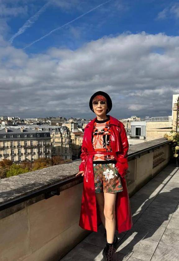 岳秀清穿了一件红色的皮衣,下面搭配了印花短裤,头发染得很时尚,真是看着特别年轻。