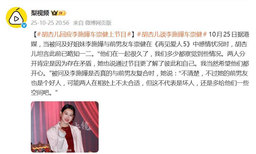 原创 胡杏儿回应李施嬅车崇健感情状况,坦言此前已略知一二
